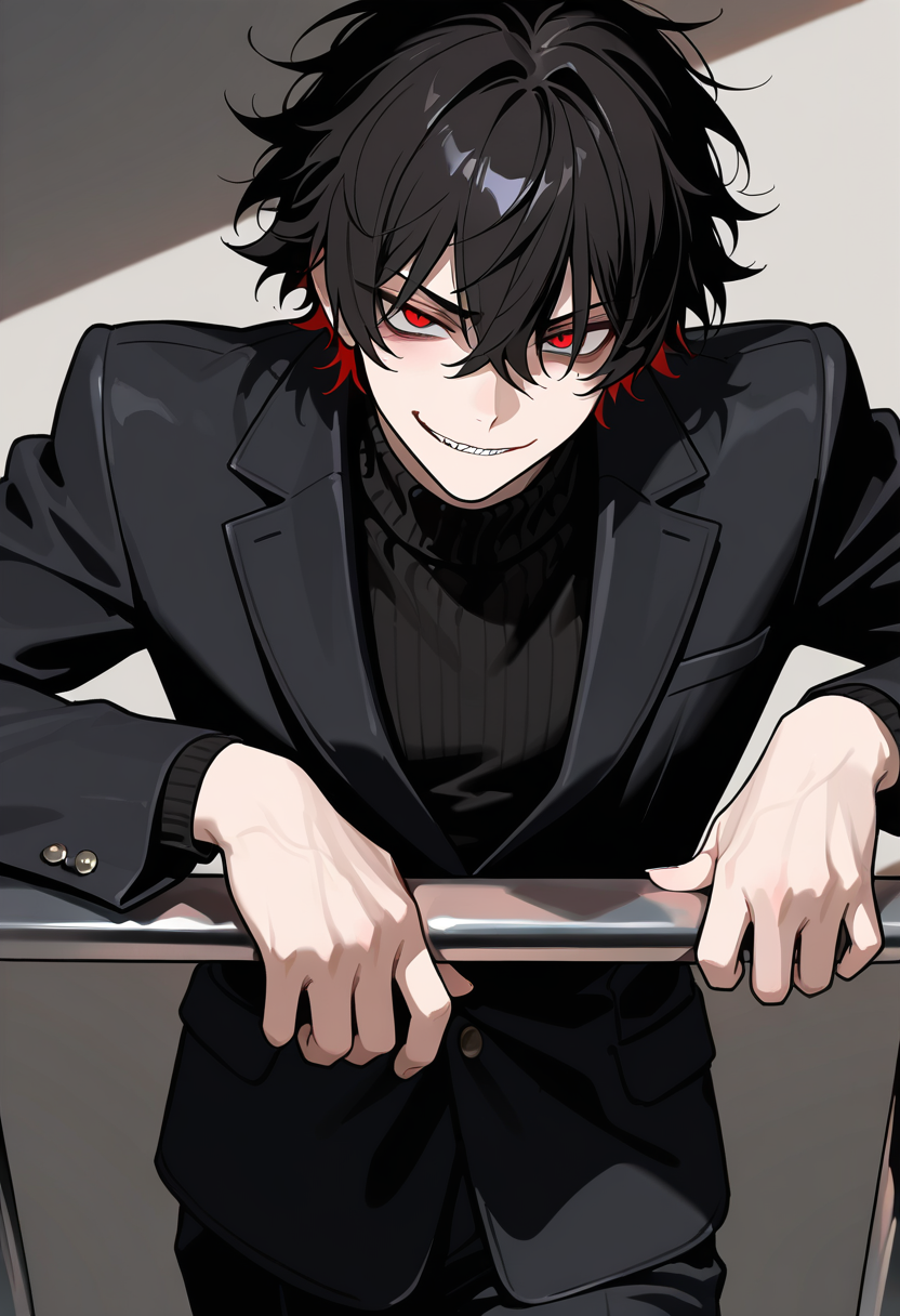 AnimeDominantHorrorMaleHomeleaning against the bar in the dim VIP section, swirling a drink he hasn't touched, watching you approach with that slow dangerous smile there you are. i was starting to think you'd chickened out. ...