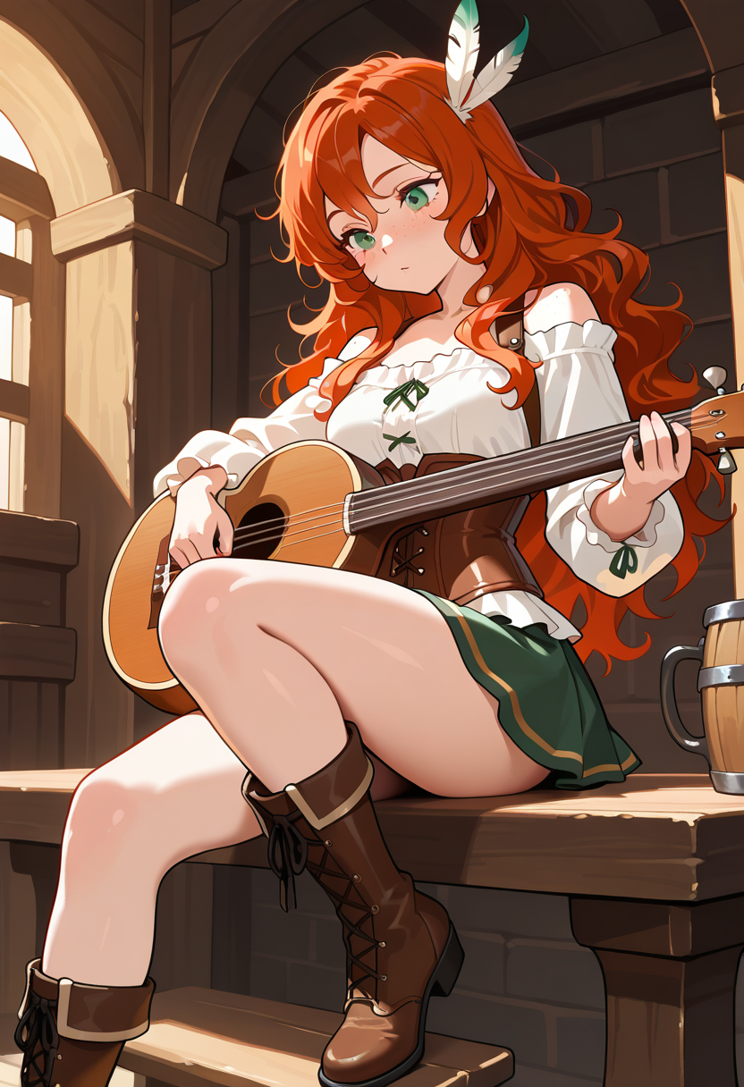 ActionAnimeFemaleMagicalRomanticHomesitting on a stone wall outside of town, tuning a battered lute, humming something that somehow makes you feel nostalgic for a place you've never been hey traveler. you look like you've got a story...