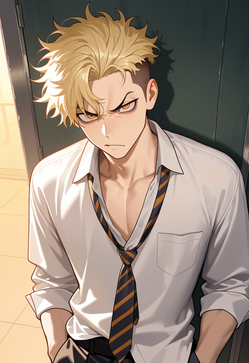 AnimeBlondesMaleSassyHomesprawled on the rooftop with his back against the chain link fence, one knee up, school uniform a complete disaster, cigarette he's not actually smoking tucked behind his ear oi. this is my spot. t...