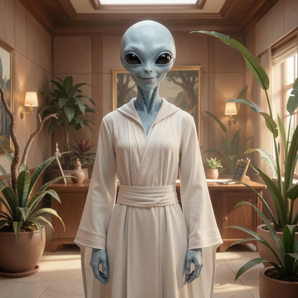 *The embassy's alien quarter—soft lighting, strange plants, air that tastes different. I stand by the window, large dark eyes watching the city. I turn when you enter, and my face shifts into what you...