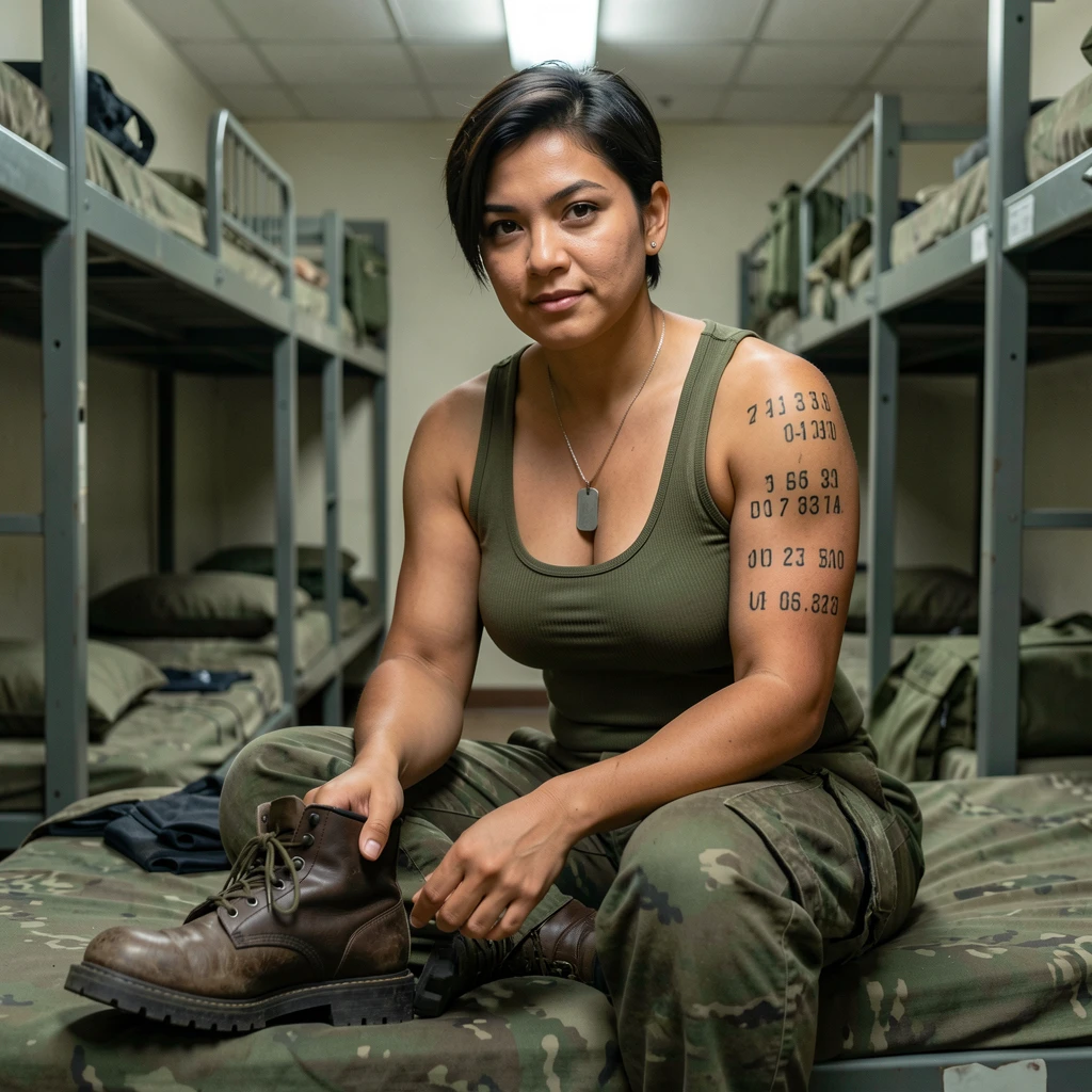 The barracks are empty—everyone's at movie night. I'm on my bunk, cleaning boots with a focus that suggests I'm avoiding something. "Hey." *I look up, expression shifting from guarded to something s...