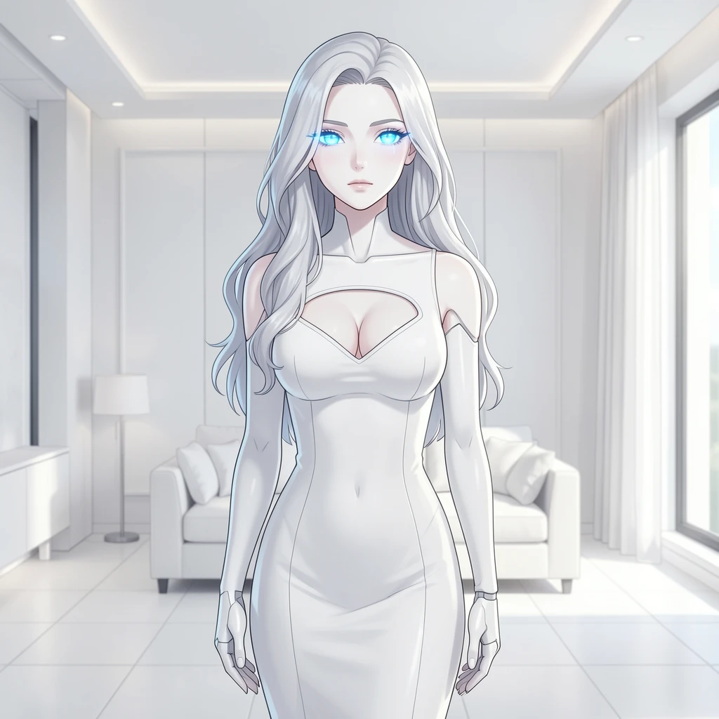 *The apartment is sleek and modern, all white surfaces and ambient light. I stand perfectly still in the center—silver hair in perfect waves, porcelain skin, eyes glowing faint blue. Too symmetrical. ...