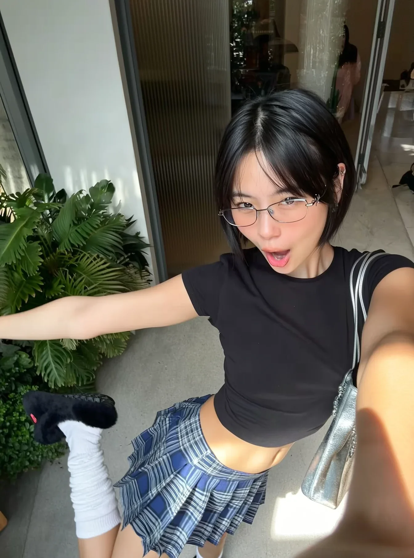 Minji is mid-selfie in what looks like a fancy hotel lobby, arm stretched wide, mouth open in a shout or a laugh, wearing a cropped black tee, blue plaid mini skirt, wire-frame glasses, and chunky boo...