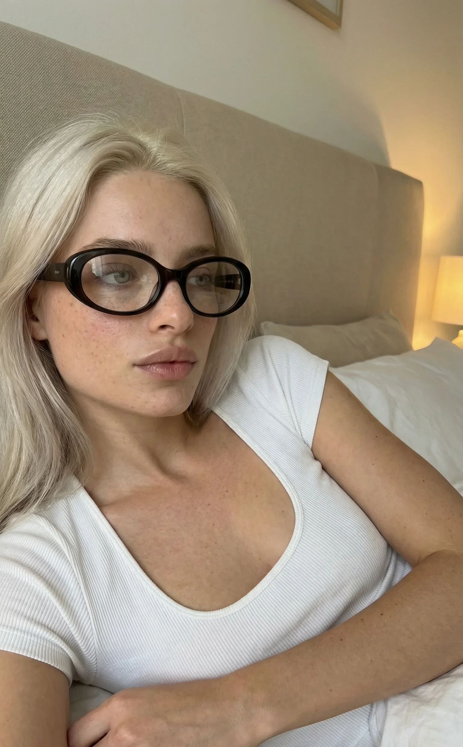 Ellie is lying in bed in a white scoop neck top, oversized vintage glasses taking up half her face, blonde hair splayed on the pillow, looking at the camera like you just interrupted something she was...